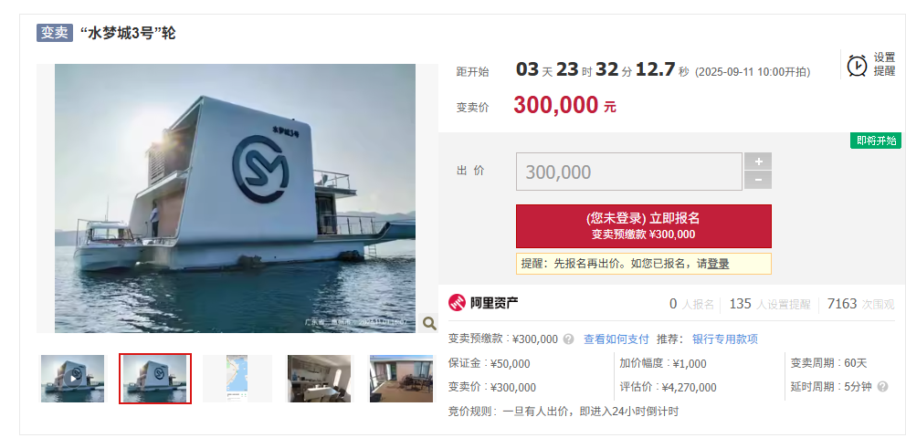 根据9月7日的红星资本局的说法,一艘游艇将以30万元的价格出售,相对审查的价格为427万元,直接崩溃为397万元。了解游艇的出售为一,两个,都没有出售。这笔销售是最后一次出售。屏幕截图从阿里巴巴拍卖平台上该主题的详细描述中表明,游艇被称为“ Shui Mengcheng No. 3”,并于2020年1月4日建造。它于2023年10月被暂停。其拥有的是Shui Zhongshu旅游业发展(Huizhou)Co,Ltd. Huizhou City,guanghou City,guanghou City,guangnongongnongong,该船的轮廓指出,该船总共有三个活着的甲板,并配备了一个压载水箱。一楼的甲板区设有主卧室和一个含义的房间,设有独立的浴室,Simmons大床和衣柜; AOF主甲板配备了开放式厨房,房间和卡拉OK娱乐设施;上层甲板有MASTer Room和一个室内的房间,设有独立的浴室,大床和衣柜等。特别提醒显示,该目标是在Taobao出售的一,两个,都没有出售。在贷方许可获得注册债务股的三分之二以上,该主题将以300,000的销售价格重新售出。 9月7日,红星资本局称公开联系电话为分配的投标人。工作人员说,这艘船“第3号舒林奇”本身无能为力,无法开车,没有获得诸如船舶国籍证书之类的证书,也无法用作船。它可以被视为水中的酒店。这是游艇的最后一次出售。谈判结束后,如果销售仍未出售,则将为“使用财产偿还债务”而支付债权人。根据公共实施,2023年10月12日,广州海事法院正在实施Shui Zhongshu旅游发展(Huizhou)Co,Ltd A这是在拍卖的,投标人必须先注册并支付销售预付款,等于出售出售的全部销售价格。据了解,此销售价格的价格为30万元人民币,利润率为50,000元,价格上涨为1,000元或一个具有多个的整数。同时,此次交易采用了没有预留价格的价格上涨:一个人注册和出价达到或超过Presyo出售,交易可以完成;如果有两个以上的人注册和出价,将以竞标方式进行,并获得更高的价格。如果您后悔拍卖,则不会退还押金。此外,根据Huizhou海事局的回应,该船仅持有该船所有者的证书,并错过了该船的国籍和其他证书的证书。如果投标人能够处理,则要求投标人自行咨询Huizhou海事局,并带来的风险将由消费者携带。目前,该船已被运送到上述泊位位置,并根据该船的当前情况处理移交程序。剩余的燃料油,润滑油,液压油等是市场价格固定的,除销售价格外,消费者还将分别投入使用。至于新闻稿,应由7163名观众和135人发布提醒。记者Yu Yao实习生记者周YI编辑:Chen Xia在发表演讲时,请遵循新闻回复服务协议